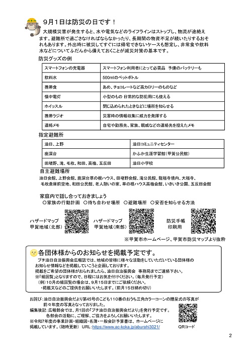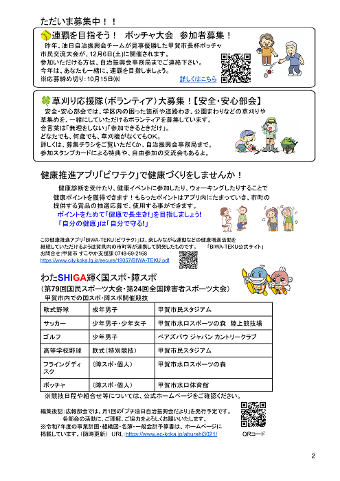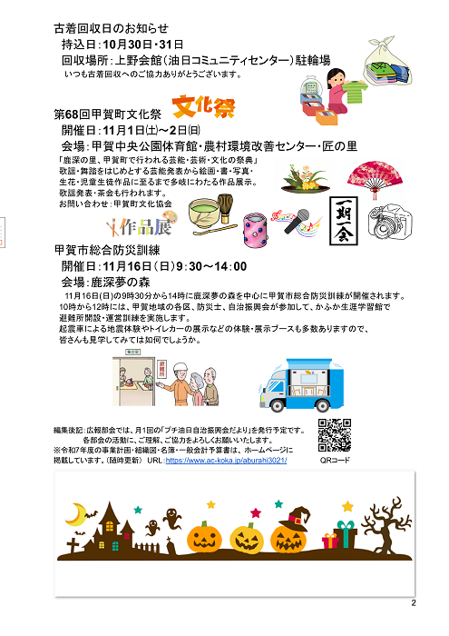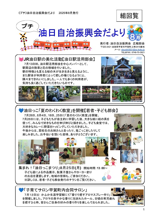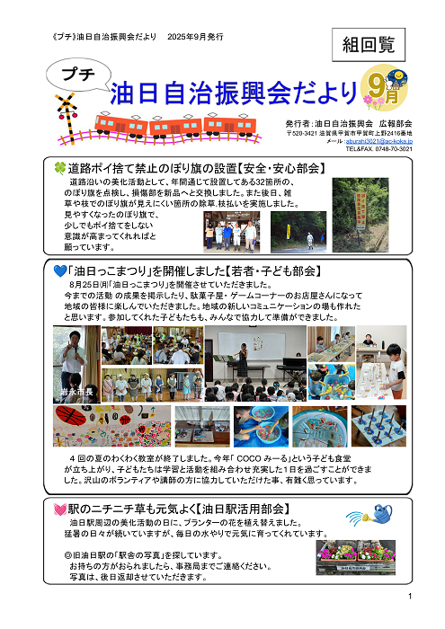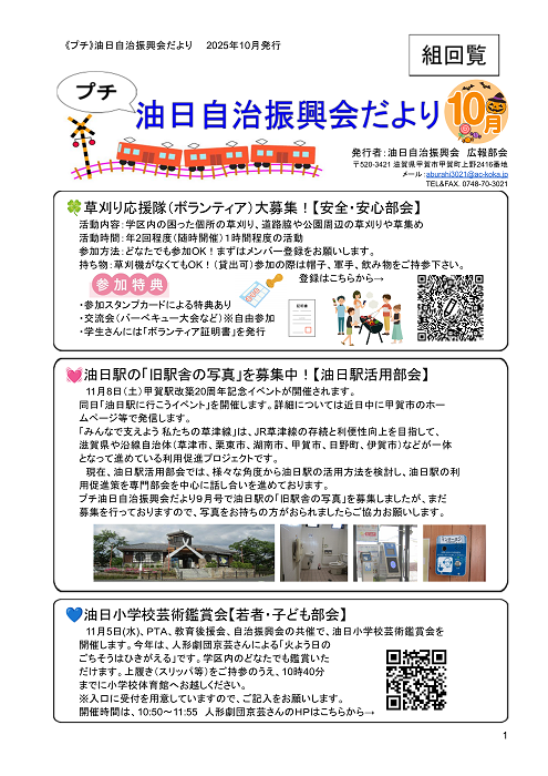 引き続き 草刈り応援隊(ボランティア) 、油日駅の「旧駅舎の写真」 募集中です。油日小学校芸術鑑賞会(11/5)、油日駅に行こうイベント(11/8)など、秋の情報満載の紙面をどうぞご覧ください。