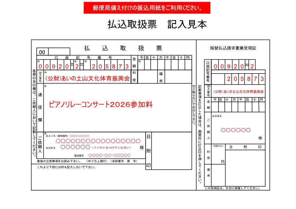 | 〈注意事項〉 | ★このコンサートは、発表会やコンクールとは異なり、音楽を愛する皆さまが年齢や経験を超えて、順番に演奏を繋ぐリレー形式のコンサートです。ご自身はもちろん、出演される皆様の演奏を楽しむ”音楽交流の場”としてご参加ください。