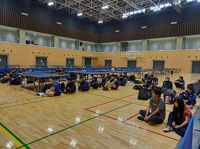 ネットを挟んで1チーム6名ずつが卓球台を取り囲むように座ります。